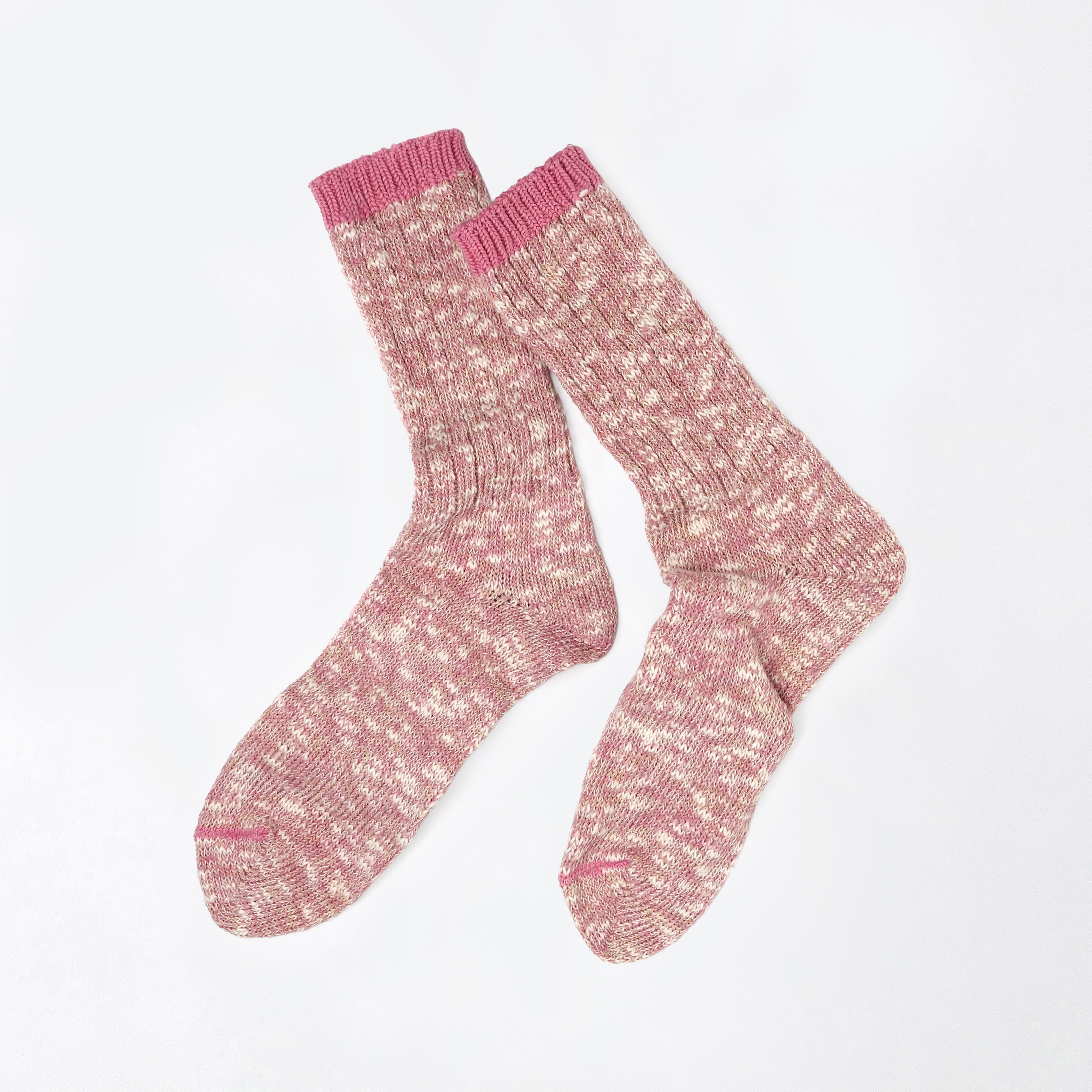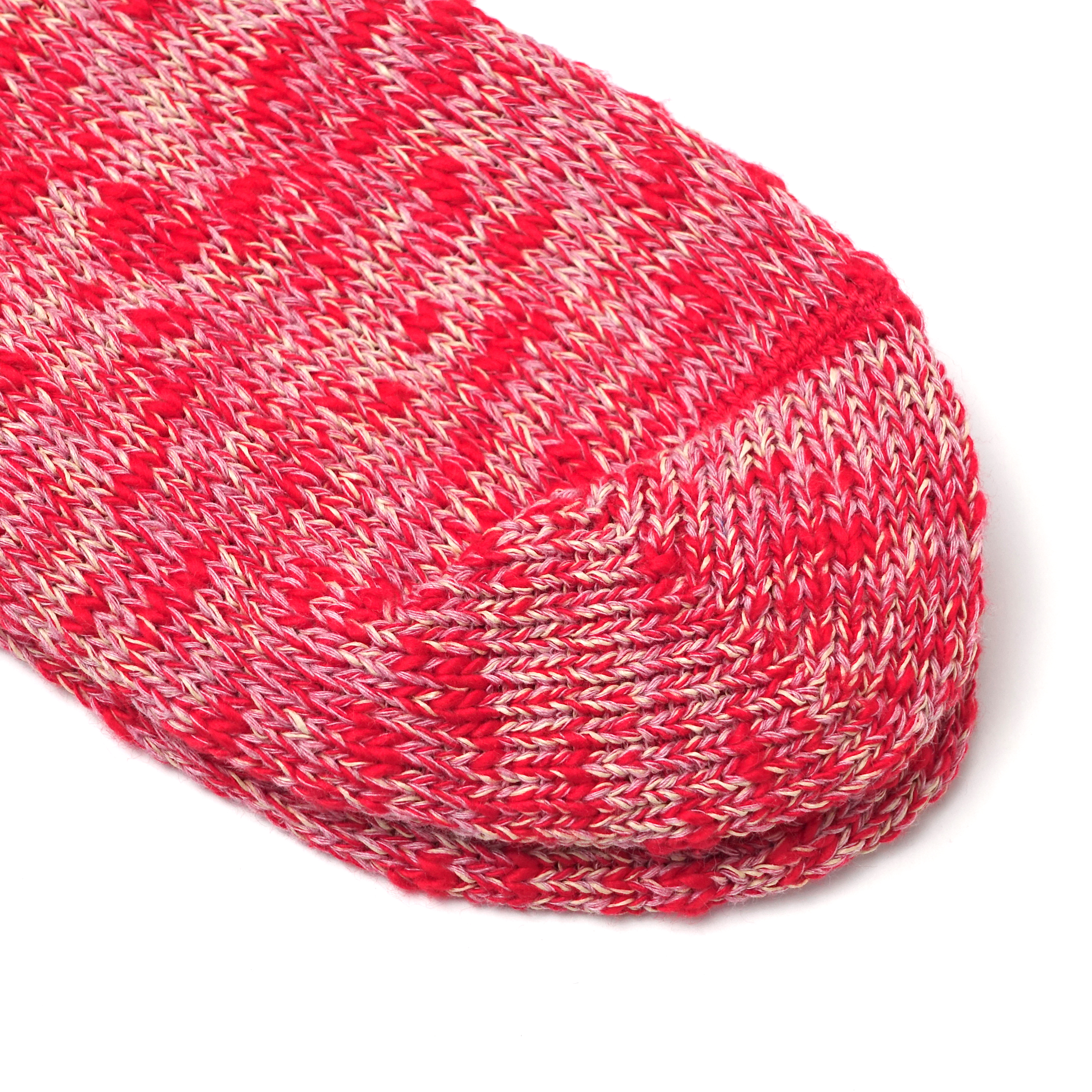 奈良・広陵町の靴下工場で出た編み立て時の端材を集めて再生したコットンにぽこぽことしたスラブの糸を撚り合わせて編みあげました。