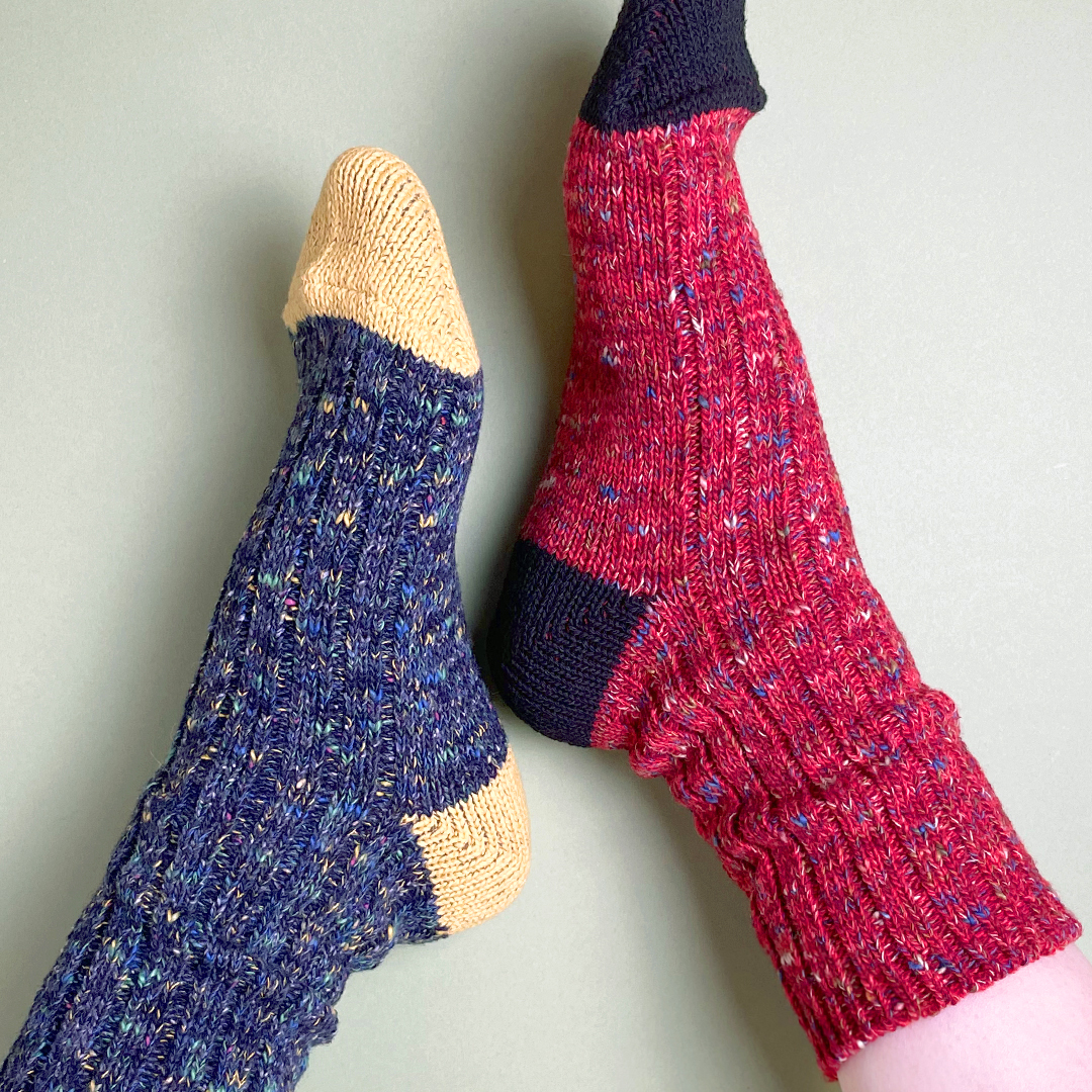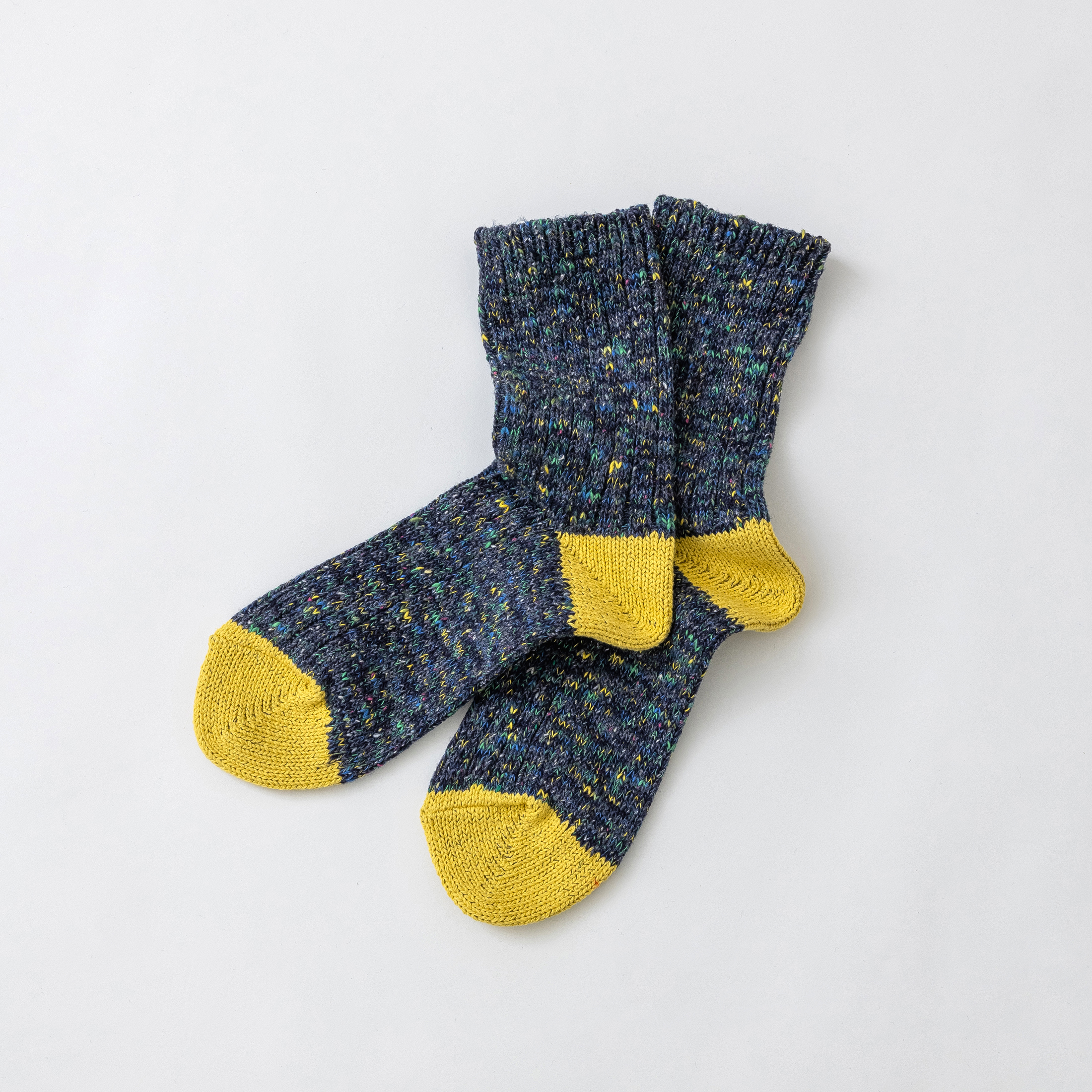 空気を多く含んだ軽くて暖かなリサイクル糸とスラブ糸、ネップ糸をバランスよく引き揃えることで、表情のゆたかなふっくらとしたソックスに仕上がりました。