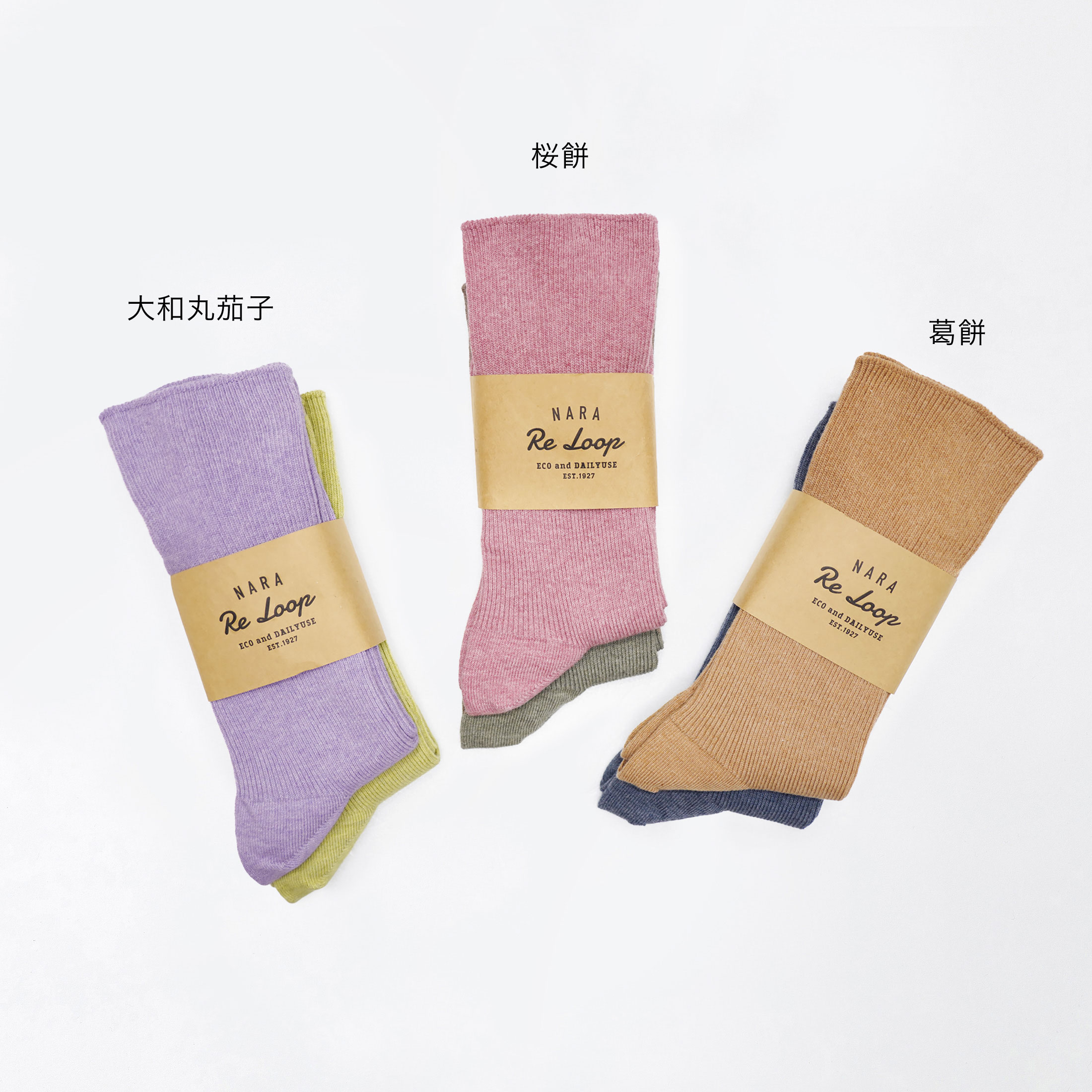 はき口部分にゴムを使わず、締めつけのないゆったりとした柔らかな肌あたりのくつ下を奈良の特産品などをイメージした2色のセットにしました。